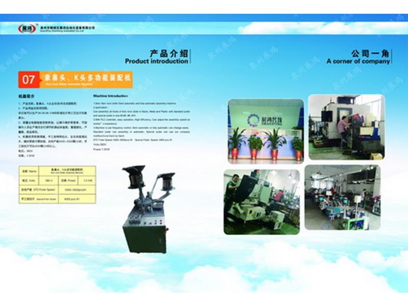??泉州市展鴻自動(dòng)化科技有限公司始創(chuàng)于2003年,是一個(gè)集研發(fā)、制造、銷(xiāo)售為一體的現(xiàn)代化公司,專(zhuān)業(yè)從事研發(fā)、生產(chǎn)各類(lèi)型號(hào)的全自動(dòng)拉鏈頭裝配機(jī)。泉州市展鴻自動(dòng)化科技有限公司始創(chuàng)于2003年,是一家集研發(fā)、生產(chǎn)、銷(xiāo)售、服務(wù)于一體的現(xiàn)代化拉鏈頭設(shè)備智能制造生產(chǎn)企業(yè):專(zhuān)業(yè)從事研發(fā)、生產(chǎn)各類(lèi)型號(hào)的全自動(dòng)拉鏈頭智能裝配機(jī)。亦可根據(jù)不同客戶(hù)的需求,提供適合客戶(hù)自身需要的“私人定制”式專(zhuān)用拉鏈頭設(shè)備及自動(dòng)檢測(cè)拉頭品質(zhì)一體機(jī)。泉州市展鴻自動(dòng)化科技有限公司始創(chuàng)于2003年,是一家集研發(fā)、生產(chǎn)、銷(xiāo)售、服務(wù)于一體的現(xiàn)代化拉鏈頭設(shè)備智能制造生產(chǎn)企業(yè):專(zhuān)業(yè)從事研發(fā)、生產(chǎn)各類(lèi)型號(hào)的全自動(dòng)拉鏈頭智能裝配機(jī)。亦可根據(jù)不同客戶(hù)的需求,提供適合客戶(hù)自身需要的“私人定制”式專(zhuān)用拉鏈頭設(shè)備及自動(dòng)檢測(cè)拉頭品質(zhì)一體機(jī)。